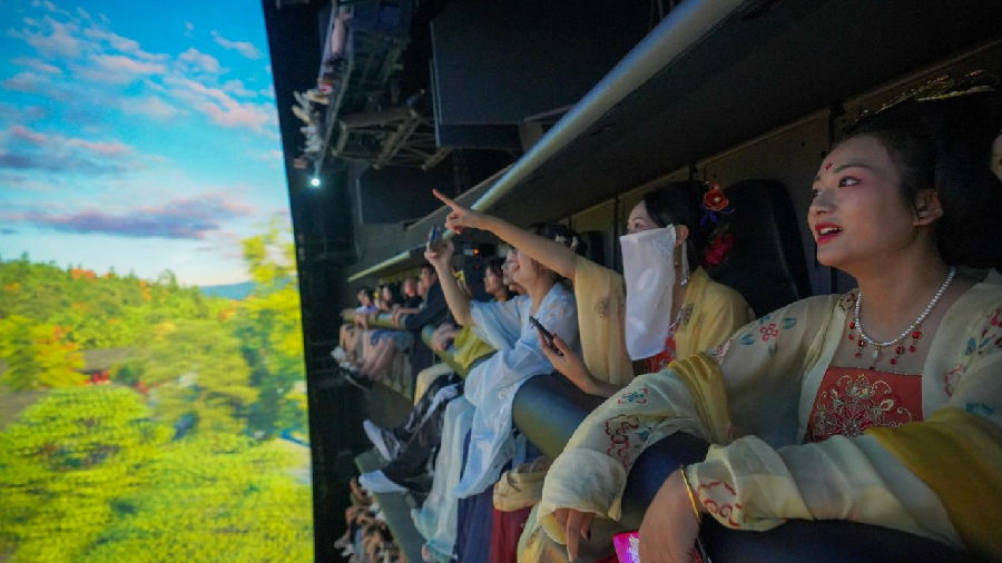 不止《成語童話》,還有真實還原動漫場景的《熊出沒劇場》、展現華夏五千年演變歷史的《九州神韻》、帶領游客穿梭于古籍丹青的《神畫》……都備受親子游客的青睞。