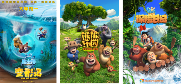 左-動畫電影《熊出沒?變形記》,中-動畫片《熊熊樂園》,右-動畫片《熊出沒之探險日記》