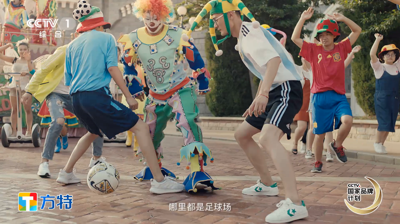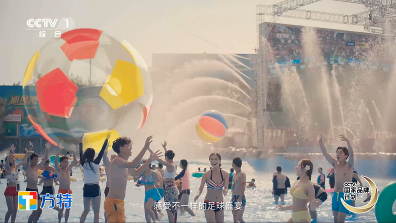 在央視的一分鐘宣傳片中,華強方特通過讓動漫明星熊大、熊二化身球員,方特化身“足球場”,吸引眾多游客歡樂互動,感受體育競技的魅力。而走進方特主題樂園,游客不僅可以看到掛滿球隊旗幟的鮮花大道,活力十足的足球寶貝,還可以親身參與到“嗨啤世界杯”、“水球運動會”等系列足球活動中,狂歡一夏。