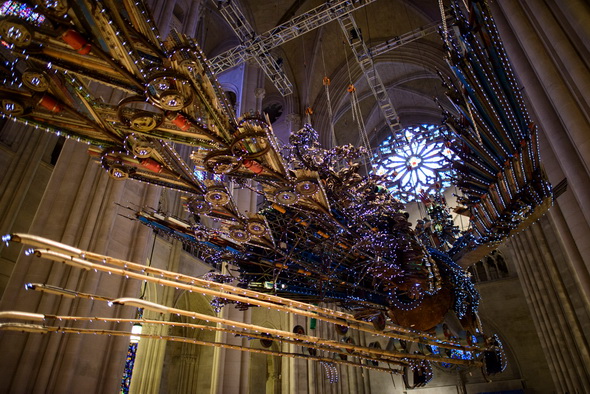 制作完成后,徐冰選擇在紐約哥倫比亞大學對面的圣約翰主教堂中展示自己的作品。大家知道,鳳凰涅槃是中國關于生命重生的故事,教堂則是西方生命重生之地,這只鳳凰上面用了一些五彩斑斕的霓虹燈,這是當代的商業文化元素,鋼鐵是西方工業革命的元素,但作品的文化內核卻是中國的。