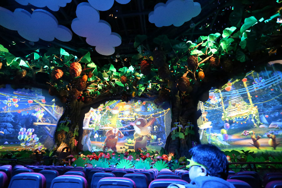 《熊出沒劇場》中的座椅設置在大型旋轉平臺上,平臺前后有兩組可展示不同內容的大屏幕。隨著情節演變,游客們將在兩組屏幕的自由轉換中觀賞影片。綜合實物景觀和大型機械動作模型的環境4D劇場,結合煙霧、光電等多種特技,通過這些創新前衛的形式演繹引人入勝的劇情,《熊出沒劇場》讓游客們走進一個有聲、有色、更有真實感的“熊出沒”童話,一同感受純真,體驗美好,分享笑聲。不僅如此,故事還巧妙地傳遞自然、環保、健康、快樂的理念,寓教于樂,讓大朋友與小朋友們都能收獲滿滿。