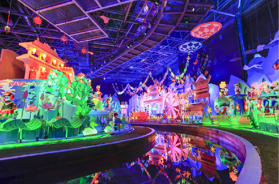 視覺(jué)上,《繽紛華夏》以色彩絢爛、充滿(mǎn)童趣的道具進(jìn)行裝點(diǎn),深受孩子們的歡迎。在體驗(yàn)這個(gè)項(xiàng)目時(shí),游客們將乘坐漂流船欣賞水道兩邊各民族的獨(dú)特風(fēng)情。隨著漂流船的行進(jìn),游客將看到許多造型可愛(ài)的機(jī)器人,它們身著維吾爾族、柯?tīng)柨俗巫濉⒐_克族、羌族等民族的傳統(tǒng)服飾,通過(guò)特別設(shè)計(jì)的歌舞,不斷演繹各民族的特色文化。