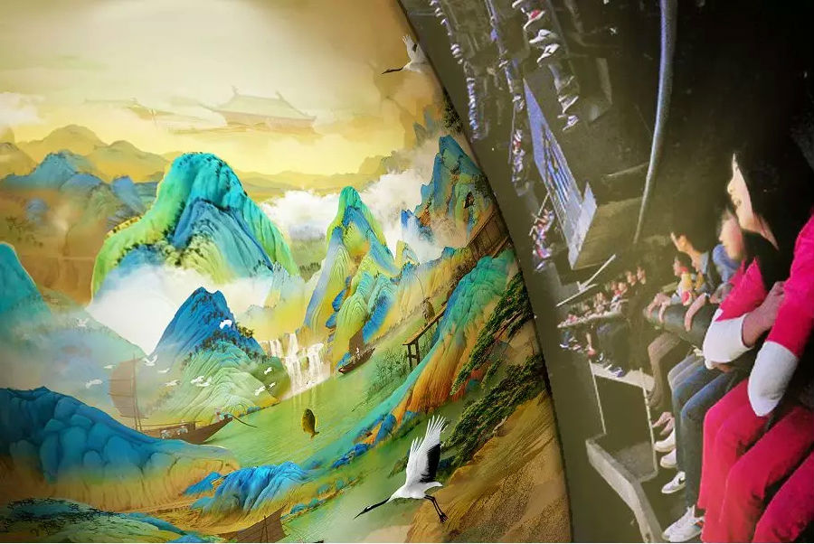 2018年8月,方特主題樂園震撼開啟了首個中國畫球幕飛翔影院項目《飛越千里江山》,廣受游客的好評。該項目還榮獲科睿國際創新節“科技創新類金獎”殊榮。華強方特300位數字藝術家耗時一年,運用數字3D技術,將傳世名畫《千里江山圖》還原在了22米高的巨型球幕上,讓游客身臨其境感受青綠山水巔峰之作的美妙意境與磅礴氣勢。《飛越千里江山》運用數字技術讓傳統文化重新綻放出獨特魅力,這件作品斬獲科睿“科技創新類金獎”可謂實至名歸。