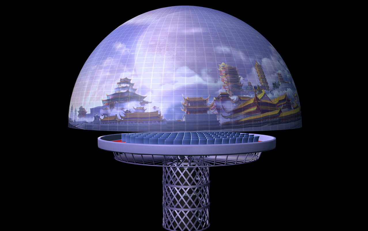 室內升降式穹頂影院主演廳分為兩層,通過大型旋轉升降式平臺連接。一層為多媒體實景舞臺,多種銀幕與實景相結合,二層為穹頂式球幕表演。根據劇情發展帶領觀眾乘坐超大型提升平臺從一層提升到9米高的二層觀影平臺,結合多種高科技表現手段,創造出震撼的動感體驗。